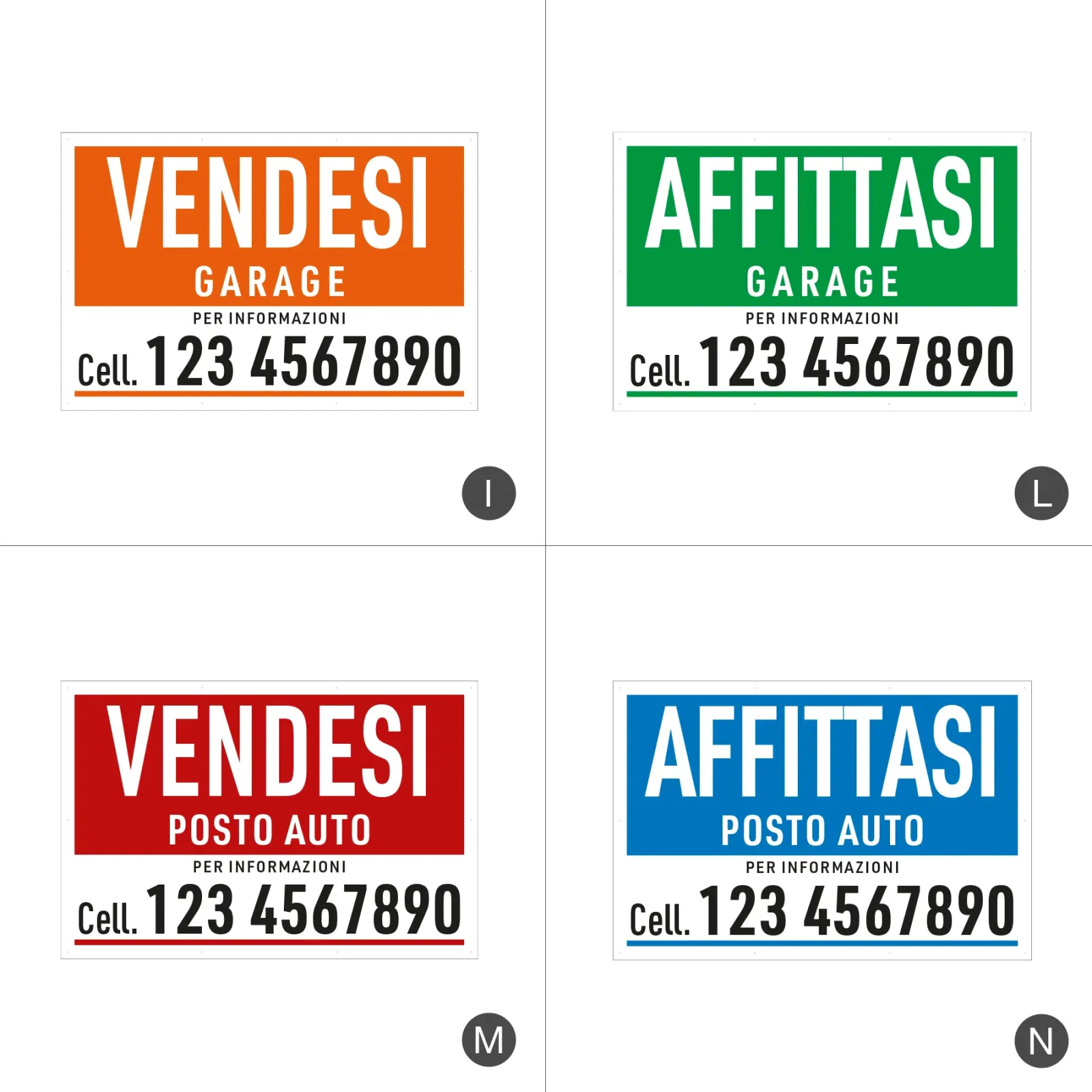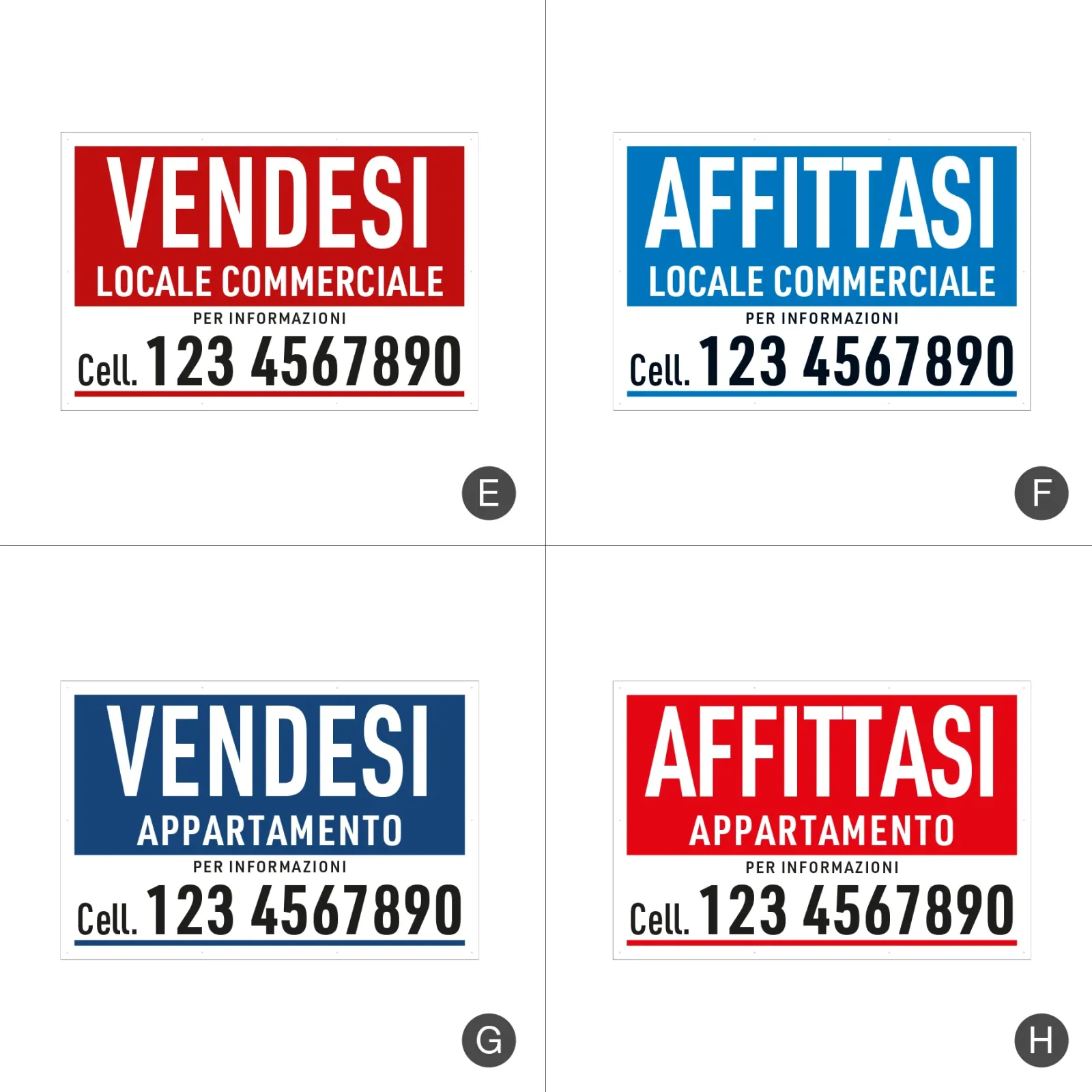 Visibilità immediata, zero attese: i nostri banner immobiliari in PVC sono pronti per essere esposti: scegli il messaggio più adatto (“Vendesi”, “Affittasi”, ecc.) da una selezione di grafiche predefinite pensate per agenti immobiliari e privati. Resistenti, ben leggibili da lontano e facili da montare su balconi, cancelli e recinzioni. Puoi personalizzarli con il tuo numero di telefono.