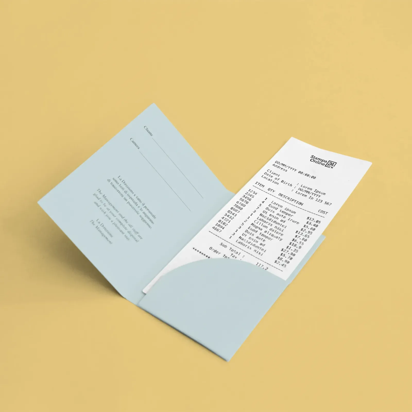 I porta scontrini in cartoncino di StampaOnline24 trasformano ogni ricevuta in un potente strumento di comunicazione. Disponibili in due pratici formati con tasca interna e in una versione senza tasca, sono perfetti per negozi, showroom, ristoranti e farmacie.